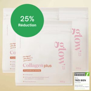Lors de nos recherches sur cette nouvelle méthode de rajeunissement de la peau, nous sommes tombés sur une page d’offre de Glow25, où le nouveau produit haut de gamme Collagène Plus bénéficie actuellement d’une une réduction de lancement de 25 %.
